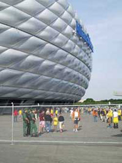 Op het terrein rond de Allianz Arena in München staan meerdere FenceBoxen met een totaal van 350 strekkende meter. De hekken zijn hier twee meter hoog.